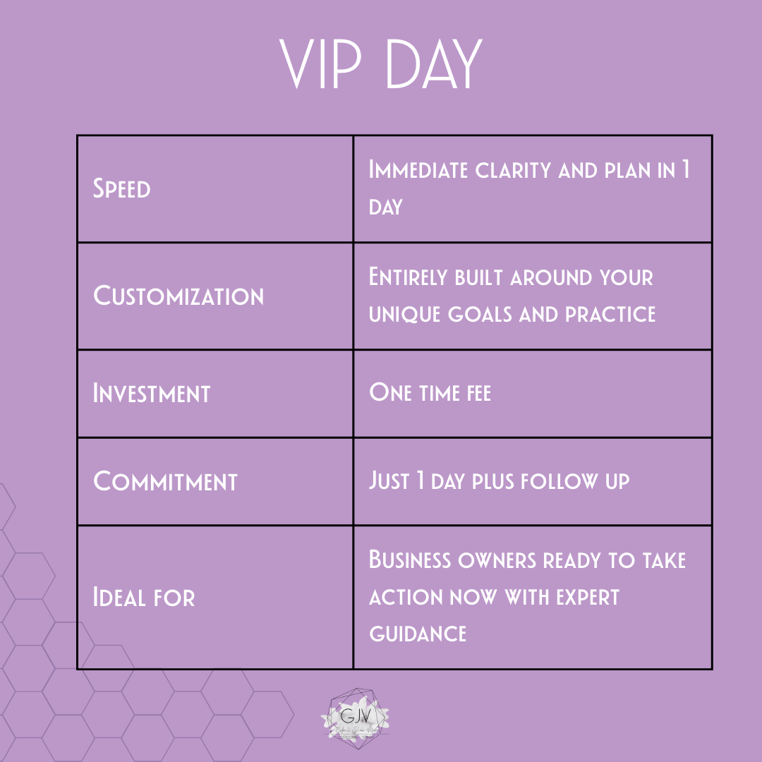 You’ve worked hard to build your practice. Now it’s time to make sure it works for you—not just your clients. Whether you’re expanding, streamlining, or shifting your focus, your VIP Day is the blueprint for a sustainable, profitable business.